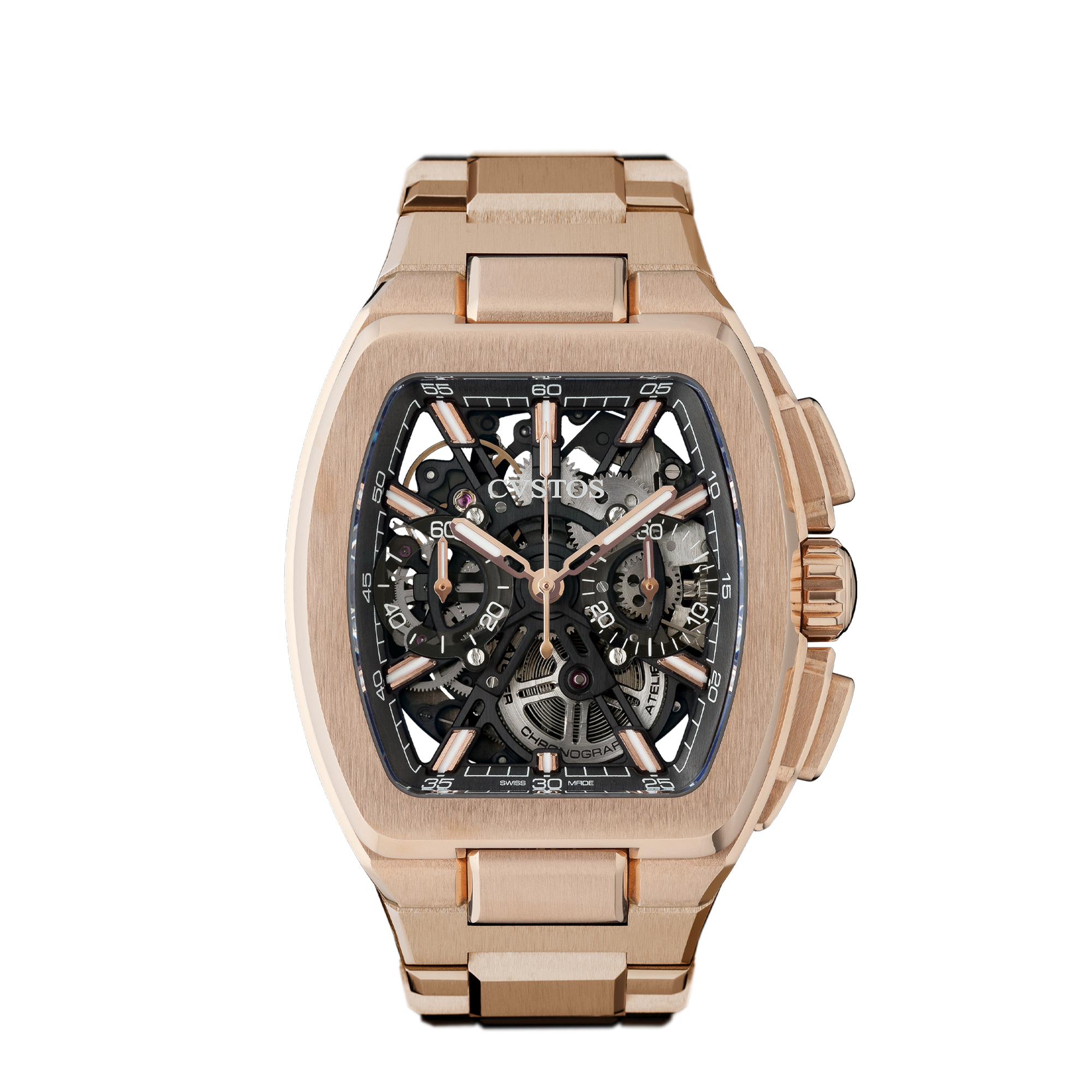 3時位置に30分積算計、9時位置にスモールセコンドを備えたクロノグラフムーブメント(CVS758)はスケルトナイズされ、直線的に仕上げられたムーブメントにバーインデックスを設置することで、デザインと機能を完全に調和させています。