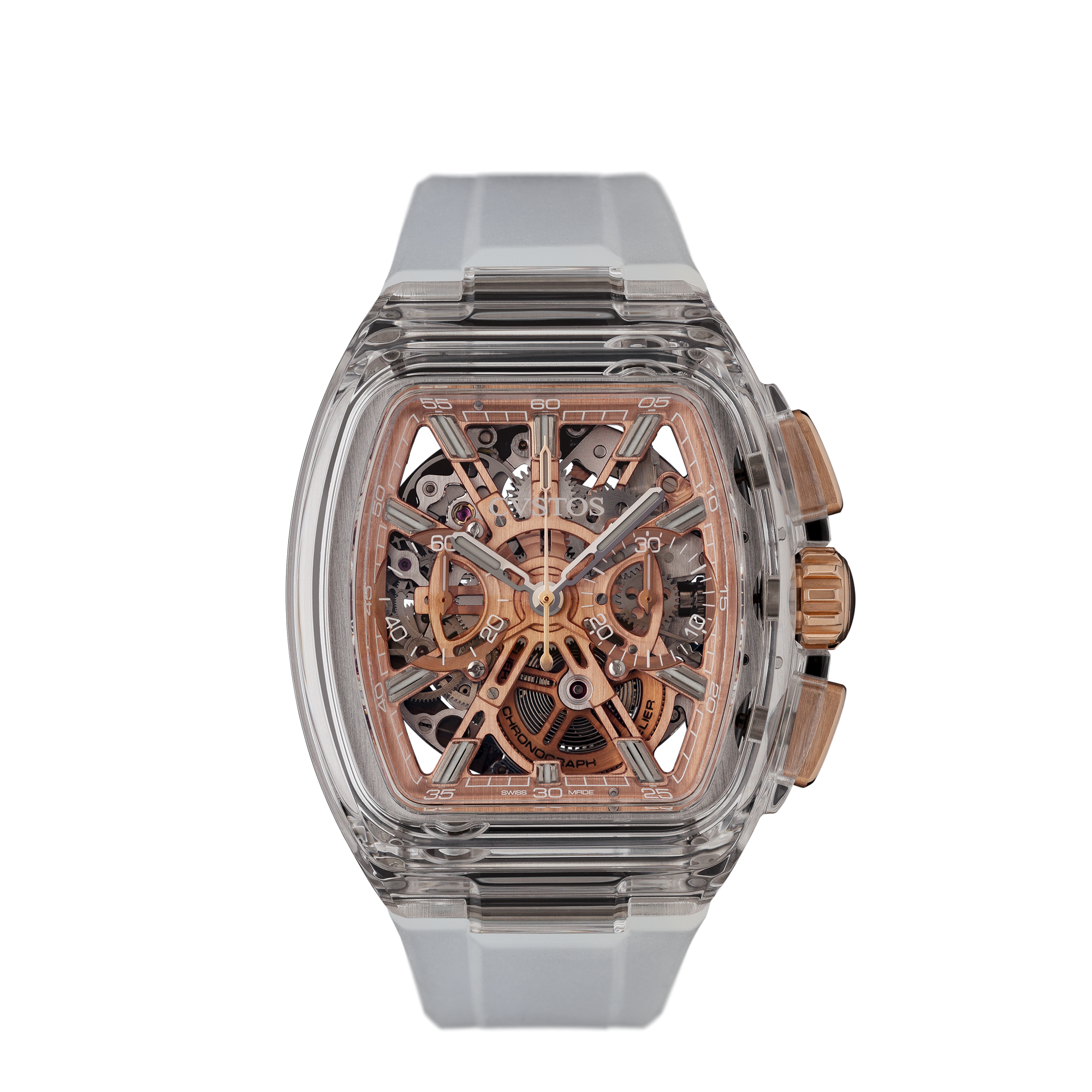 3時位置に30分積算計、9時位置にスモールセコンドを備えたクロノグラフムーブメント(CVS758)はスケルトナイズされ、直線的に仕上げられたムーブメントにバーインデックスを設置することで、デザインと機能を完全に調和させています。サファイアクリスタルケースに収められたスケルトンムーブメントは360度どこからでも中を見ることができ、童心や好奇心をくすぐる仕掛けとなっています。