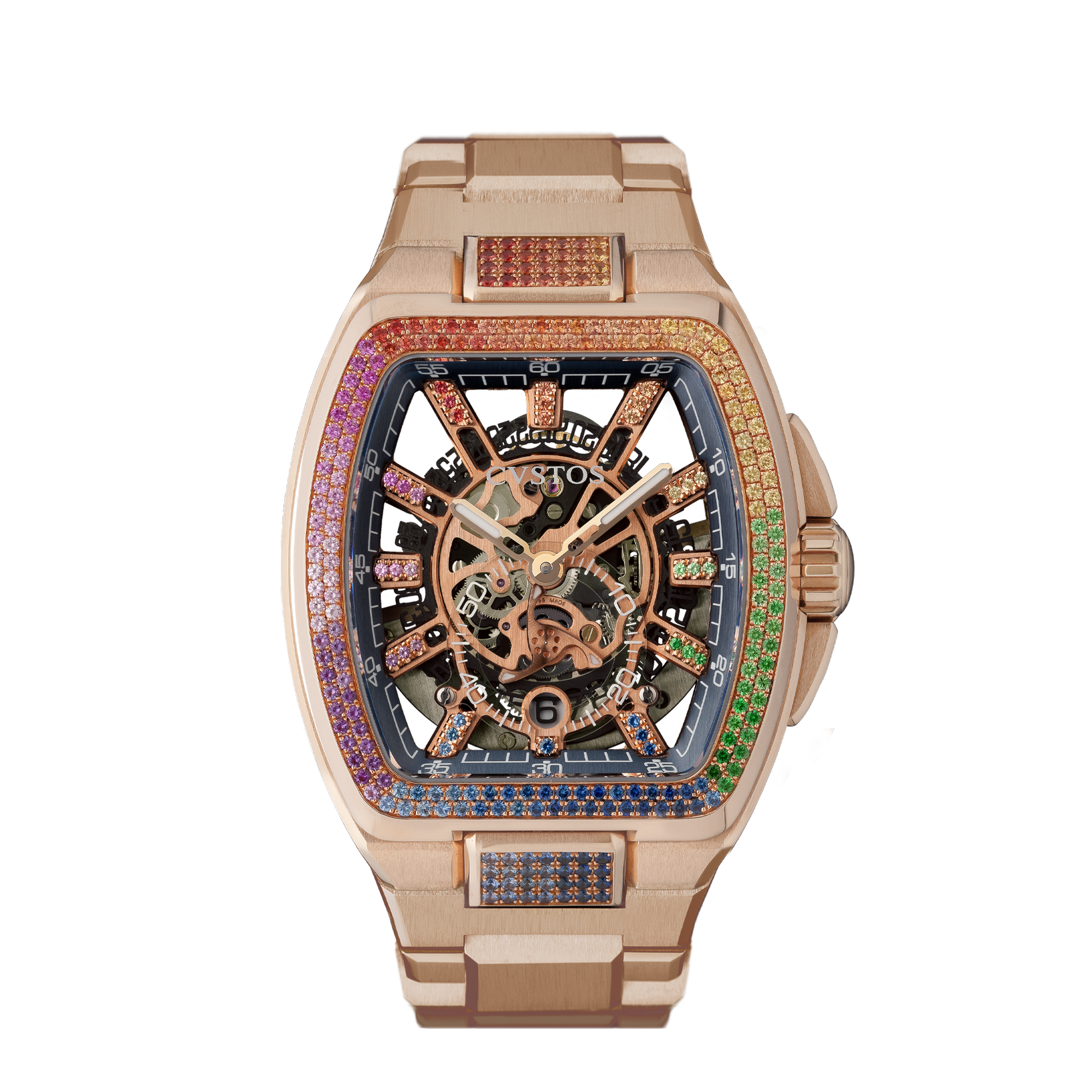 従来のクラシックというと、ゴールドケースの時計がシンプルなフェイスデザインを採用する中、本作は、大胆なスケルトンダイアルとサファイアの輝きを融合させ、唯一無二の個性を実現しました。
