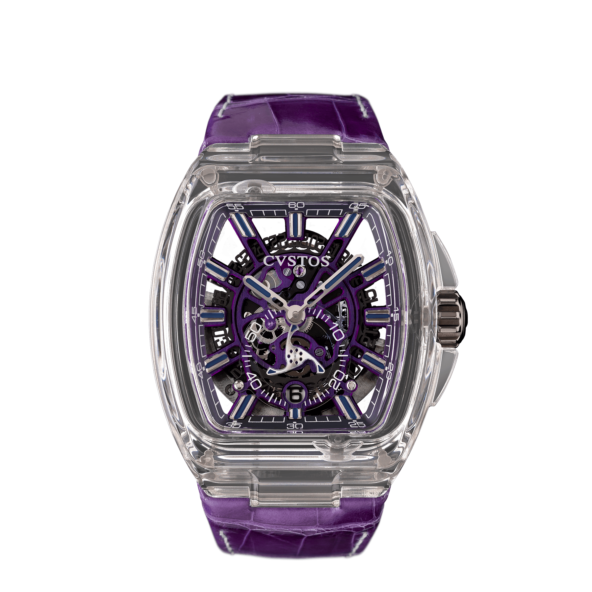 “洗練された都会”をテーマとしたコレクションに変化する都市の表情を思わせるカラーリングが登場。透明なサファイアクリスタルケース越しに見える色彩やダイアルのメタリックなパープルカラーは、雨に降られるメトロポリスのようす、そして濡れた街路に反射する光を映し出しています。サファイアクリスタルの硬質な輝きのなかにちりばめられたパープルとアクセントとして添えられたネイビーの組み合わせが、「メトロポリタン P-S スケルトン サファイア」が表現する大都市で過ごすライフスタイルのひとつの時間の美しさを際立たせています。