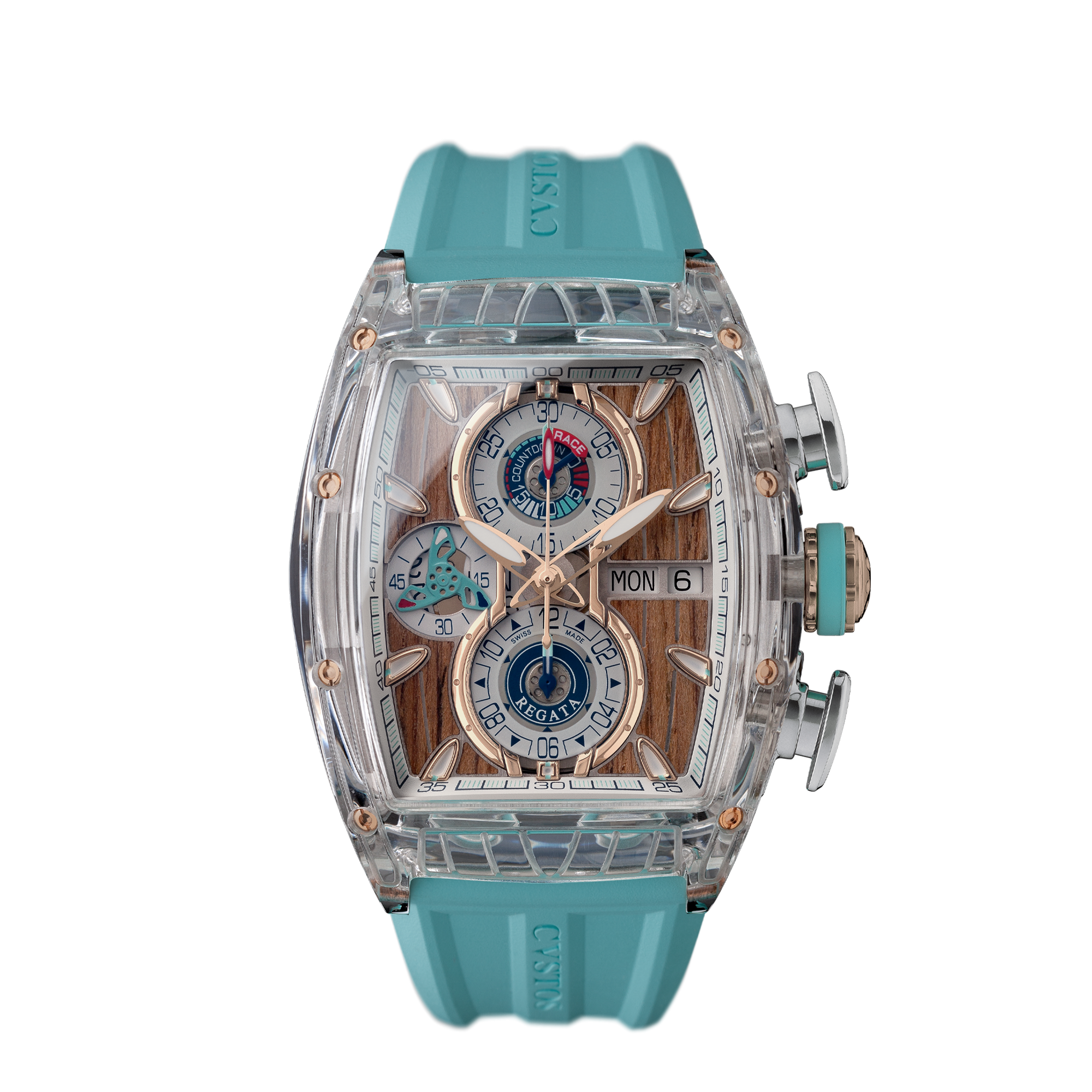 「チャレンジ シーライナー クロノ」は、地中海に浮かぶラグジュアリーヨットの卓越した伝統とモダンなデザインからインスピレーションを受けています。優雅な流線形のフォルムと洗練されたディテールが随所に凝縮されています。ヨットの帆を連想させる時分針、楕円形のムーブメントパーツは船そのもののシルエットを表現しています。さらに、ウッドデッキを想起させる本物のチークウッドダイアル、地中海の青い海を思わせるマリンブルーの配色など、ヨットの魅力を連想させる様々なディテールが施されています。さらにケースには水のような透明感を持つサファイアクリスタルケースを採用し、360度どこからでもムーブメントの構造を確認できるようになっています。これらの要素は、海の自由な精神と優雅なクルージングのライフスタイルを力強く結びつけています。