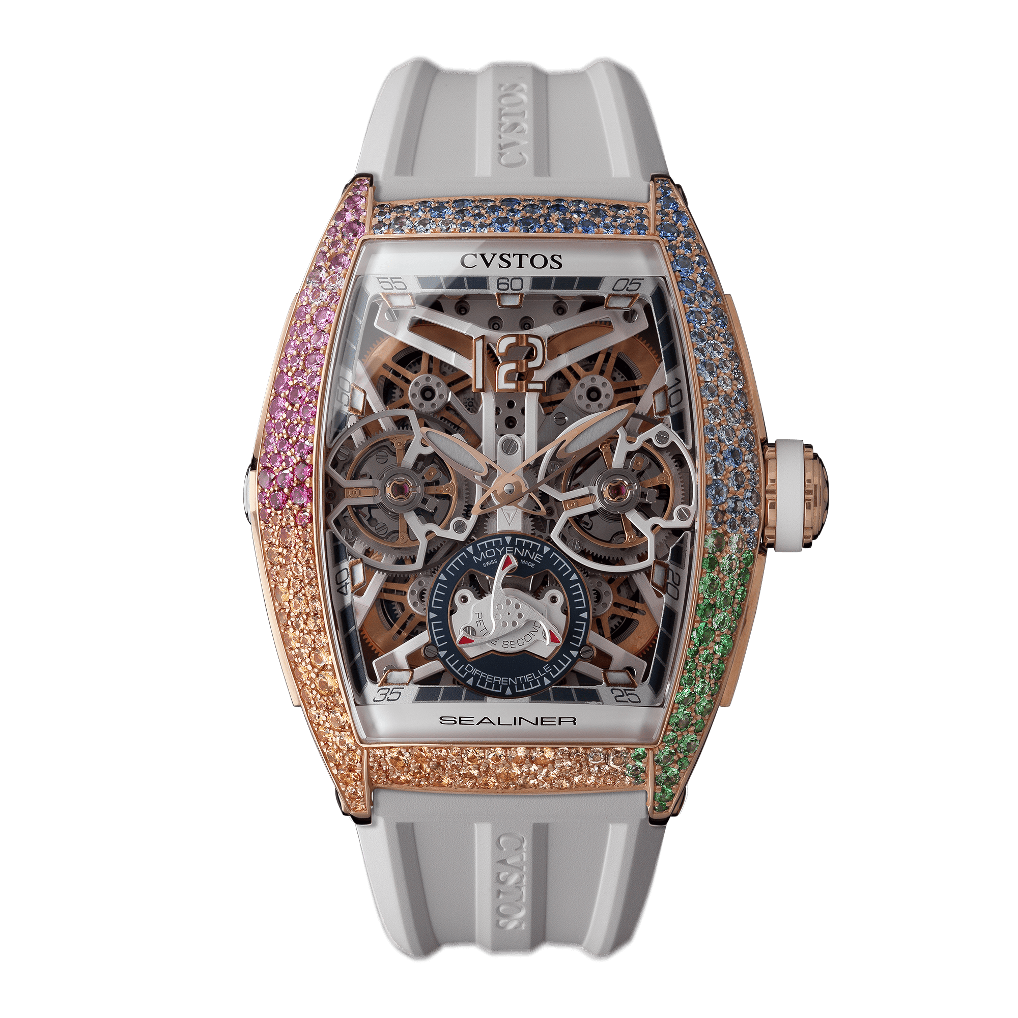 ラテン語の ”"EQVILIBRIVM(イクゥビリリウム)”"バランスや調和を意味するキーワードが掲げられたこのモデルは、特許を取得した独自のメカニズムでエネルギー伝達を効率化し、クストスのあくなき挑戦と技術力を象徴しています。迫力ある2基のトゥールビヨンを存分に眺められるスケルトン構造の文字盤は、旗艦コレクションであるSEA-LINERをギガヨットのコンセプトでよりラグジュアリーにブラッシュアップ。18KRGケースにブルー、グリーン、イエロー、ピンクのサファイアをセッティングし、クストスが追及するハイテク、スポーティ、エレガンスを、メカニズムとデザインの両側面から強調しています。