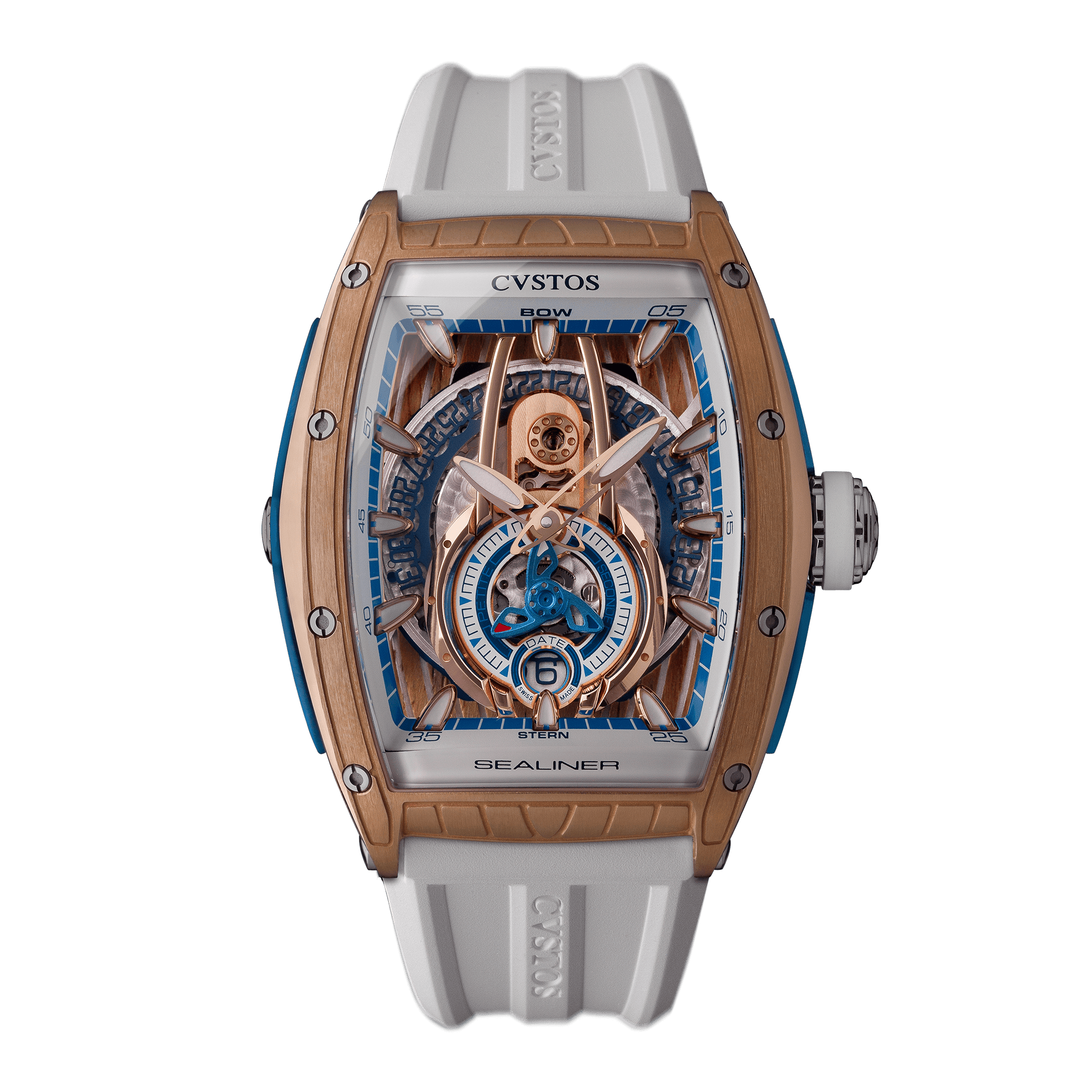 「チャレンジ シーライナー P-S オートマティック」は航海から生まれた美学に着想を得て、透明のダイアルとシースルーバックを採用し、ムーブメントの見事な機構を楽しむことができる、視認性の高いデザインに仕上げられています。6時位置にあるスモールセコンドには、船のスクリューを想起させる羽根車が取り付けられ、機能性がデザインにおいても表現されています。