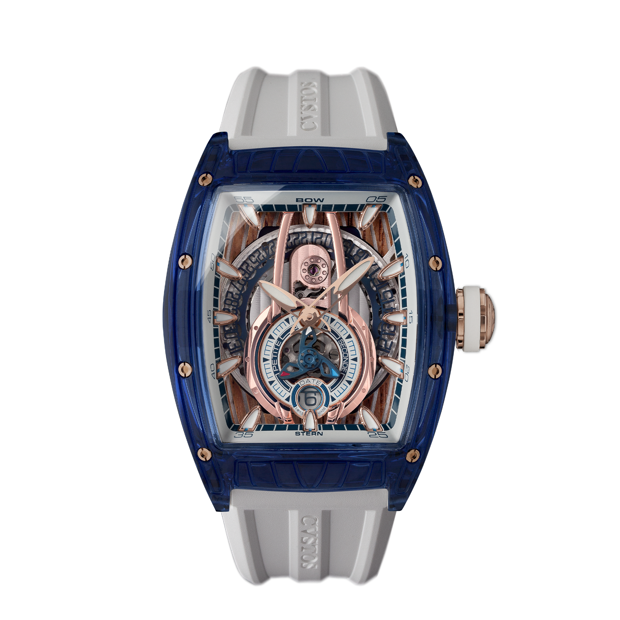 ケースにはサファイアクリスタルを採用し、360度どこからでもムーブメントの構造を確認できるようになっています。 クストスは創業時から高級機械式時計に新たな価値を吹き込むことを信念としてきました。第1作目からスケルトンウォッチをデザインコンセプトとし、高級機械式時計の歴史に大きなインパクトを与えてきました。その集大成ともいえる本作は、ムーブメントの包み込むケースが完全に透けており、隠す部分が一切なく、本来見えないものを見せるファンタジーのような腕時計となっています。