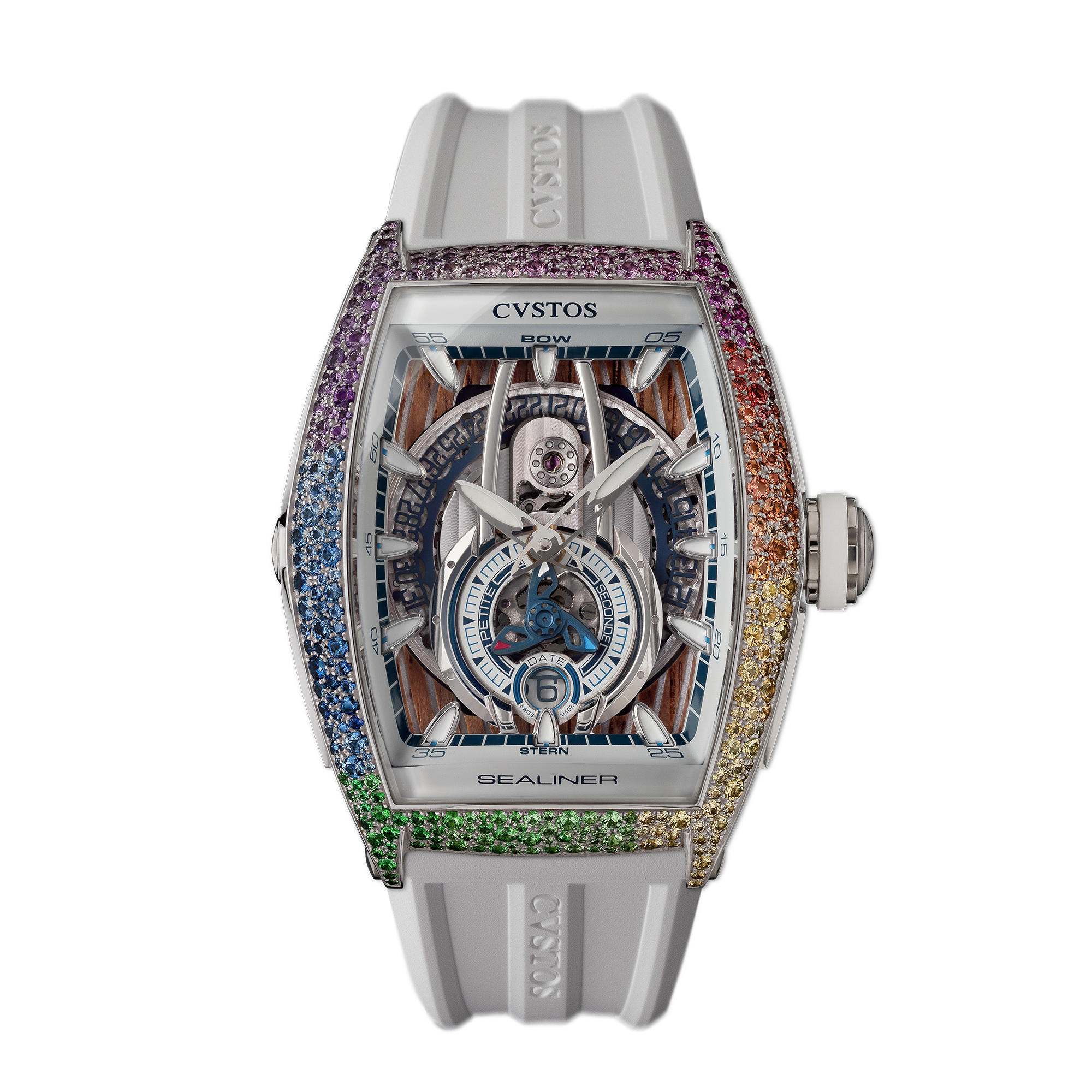 エレガントでありながらスポーティな洋上の精神を形にした「チャレンジ シーライナー」コレクションの一つ、「チャレンジ シーライナー P-S オートマティック レインボー」。このモデルの特徴は、ブルー、グリーン、イエロー、ピンクのレインボーサファイアの鮮やかな色彩がケースを彩り、機械式時計にとっての敵であった“磁力”をムーブメント内部に採用しています。