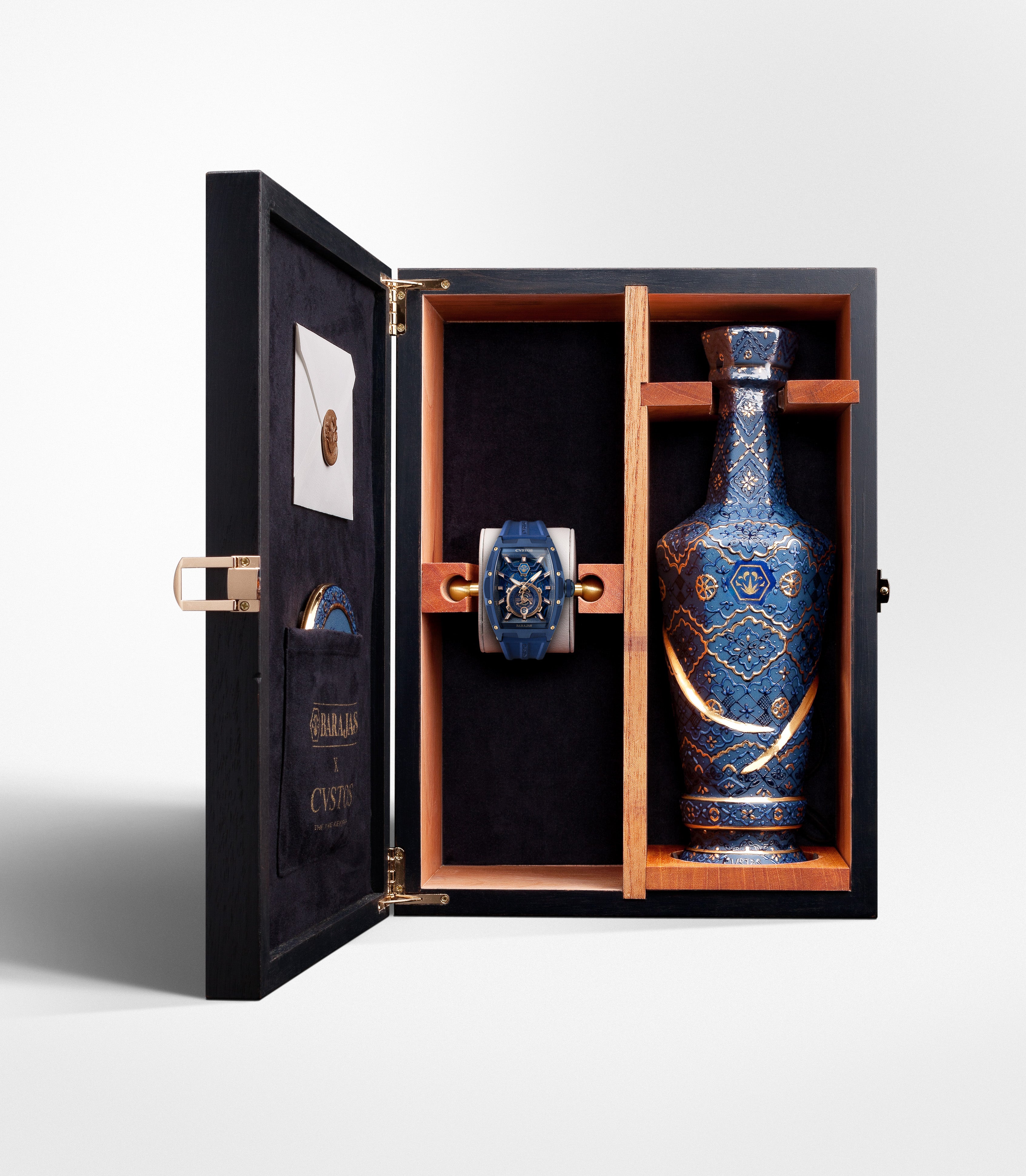 このコラボレーションをさらに特別に演出するため、テキーラ バラハスはクストスのために最高級のExtra Añejo(エクストラ・アニェホ)を収めたスペシャルボトルを制作しました。歯車や飾りネジなど、クストスの腕時計づくりに欠かせないディテールが、ボトルデザインに織り込まれています。これらはメキシコの伝統技法であるセルビン焼きによって形作られ、職人の手により一点一点丁寧に仕上げられています。限定モデルのオーナーには、この特別なスペシャルボトルが贈られます。